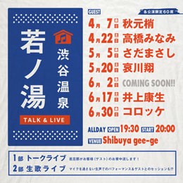 肩を並べて湯に浸かれば、思いがけずとも会話が弾む。本音が飛び出す。そんな不思議な力を持つ銭湯が渋谷のライブハウスgee-geに突如出現。その名も「渋谷温泉 若ノ湯」。店主の若旦那が日頃から本音で語り合える仲である特別なお客様をお迎えして、若ノ湯でしか聞けないあんなことやこんなことをお話しちゃいます。はたして、今宵の湯加減はいかに?